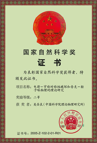 第一完成单位:理论物理研究所 获奖奖种:国家自然科学奖 获奖时间:2005 获奖等级:2 内容简介: 电荷-宇称对称性破坏和夸克-轻子味物理的理论研究,2005年荣获国家自然科学二等奖。该项目对探索了近40年的直接CP破坏给出更精确和自洽的理论预言,得到欧洲核子中心和美国费米实验室两个重要实验的证实,同时解释了困扰粒子物理学界近50年的所谓ΔI=1/2规则。完整建立CP对称性自发破缺的双黑格斯二重态模型,并对其中的一些重要物理唯象进行系统研究,此模型成为CP破坏起源的一种新物理模型。